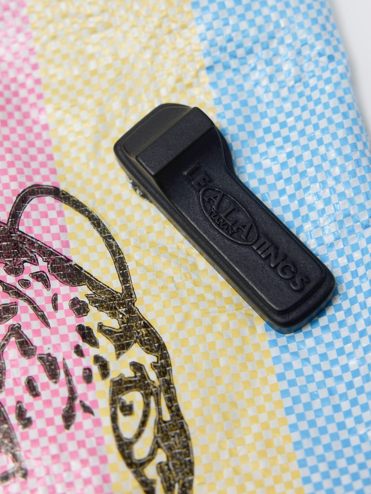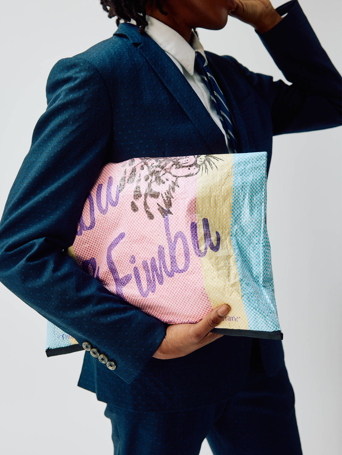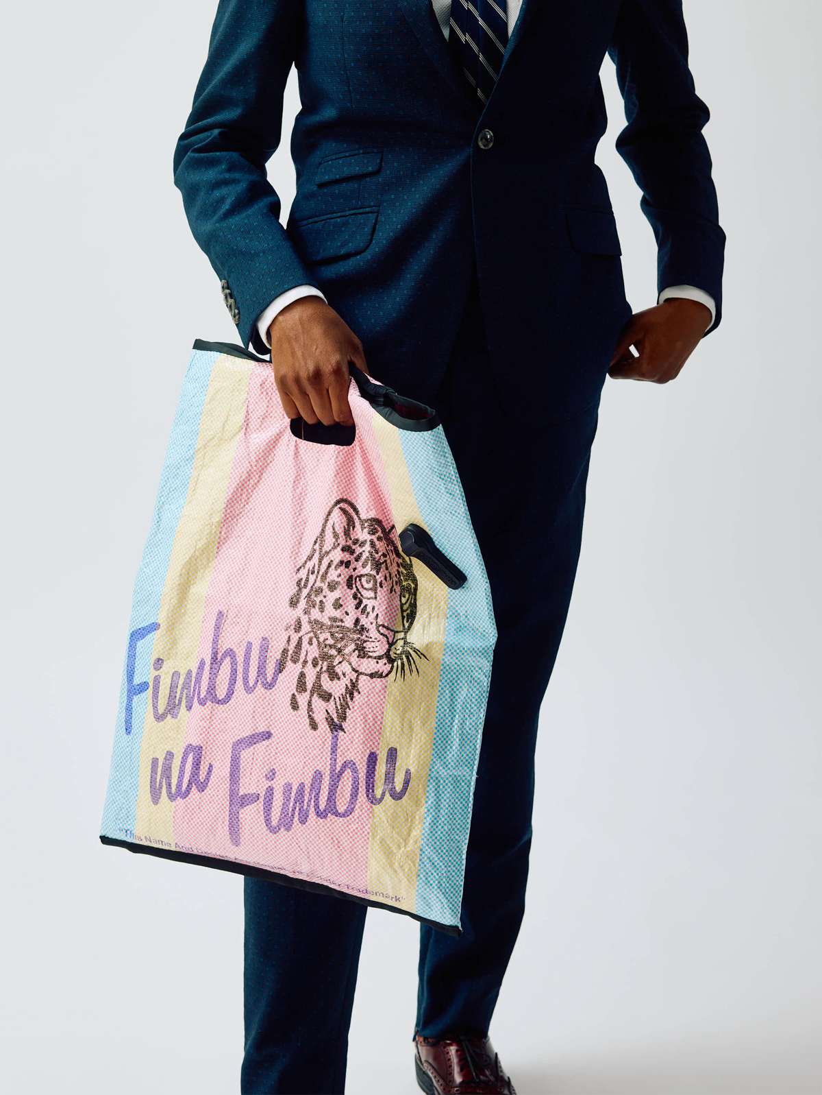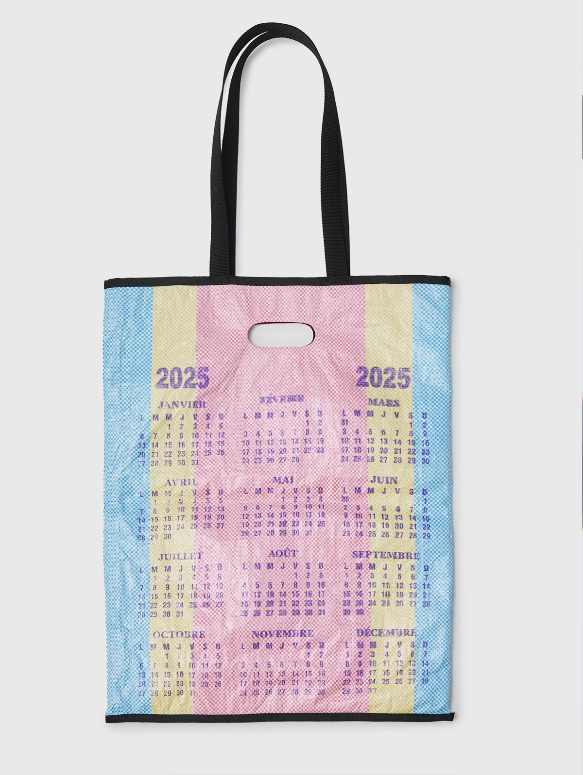 Printed in Kigali and Made in England, the Calendar Bag is produced from woven plastic yarn, lined with premium durable cotton. Each bag is finished with grosgrain trim and a 3D printed security tag embossed with the Le Tings logo. The Calendar Bag features grab handles and webbing tote handle straps for alternative use.