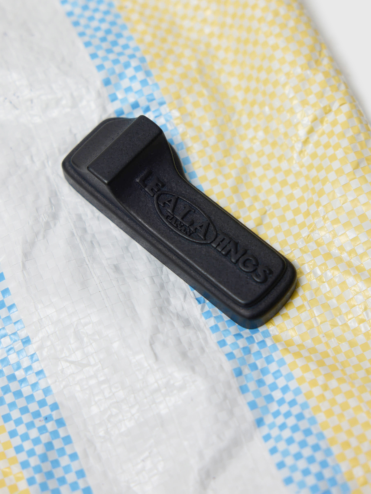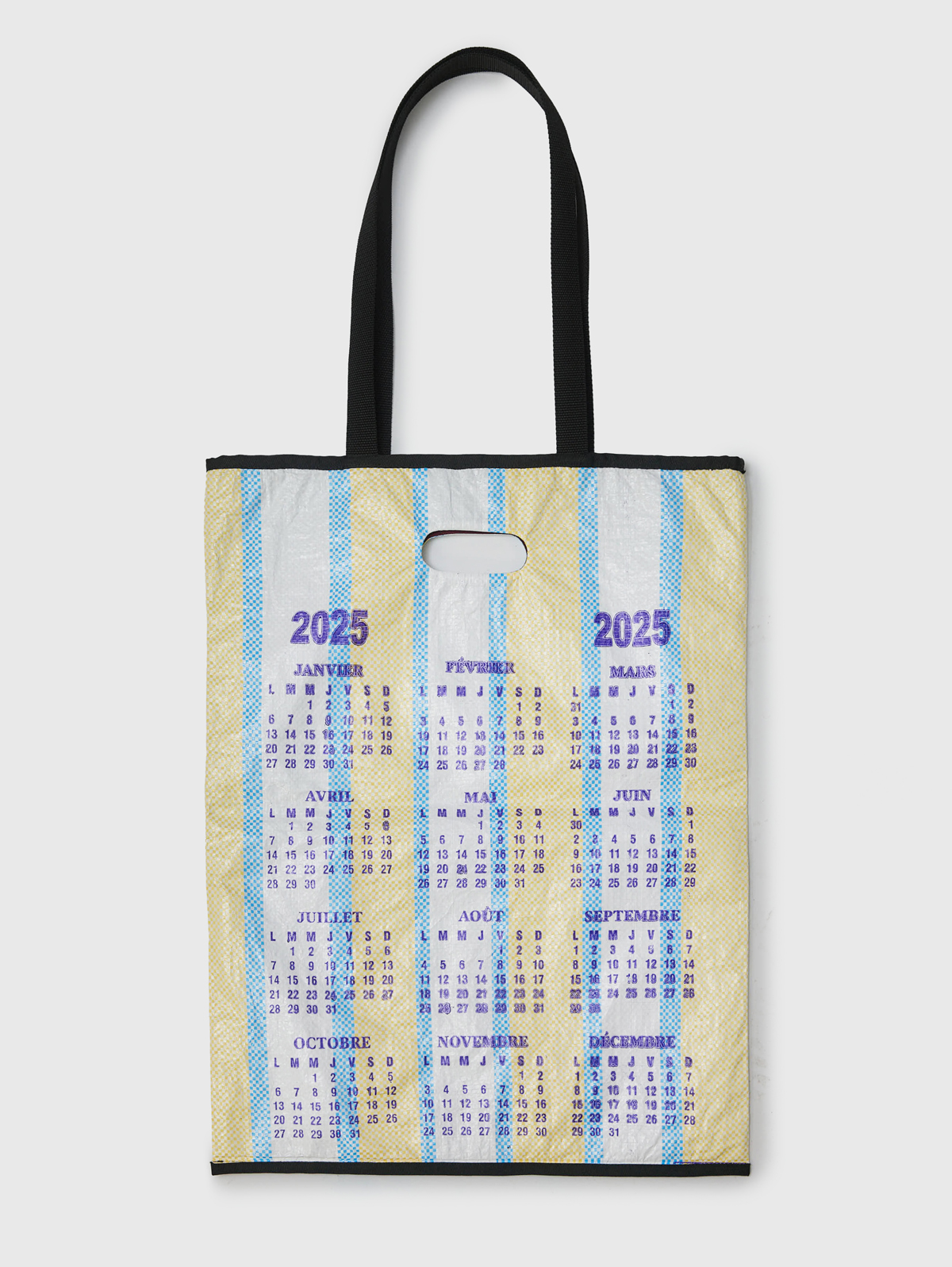 Printed in Kigali and Made in England, the Calendar Bag is produced from woven plastic yarn, lined with premium durable cotton. Each bag is finished with grosgrain trim and a 3D printed security tag embossed with the Le Tings logo. The Calendar Bag features grab handles and webbing tote handle straps for alternative use.
