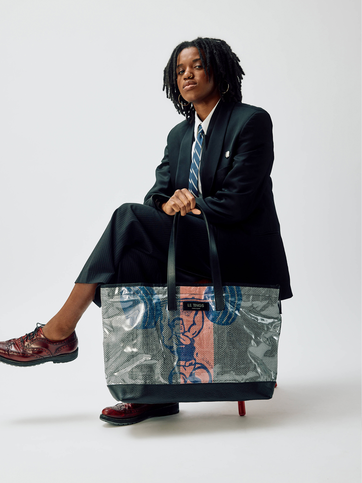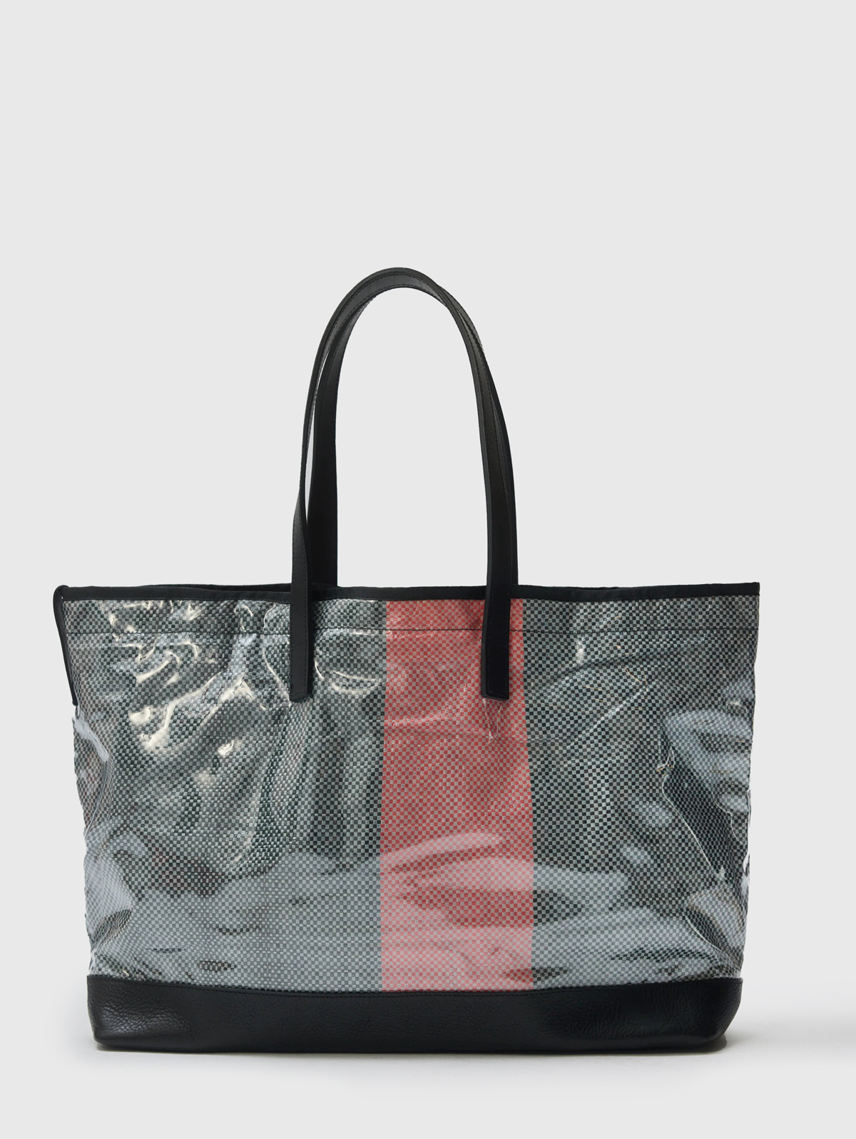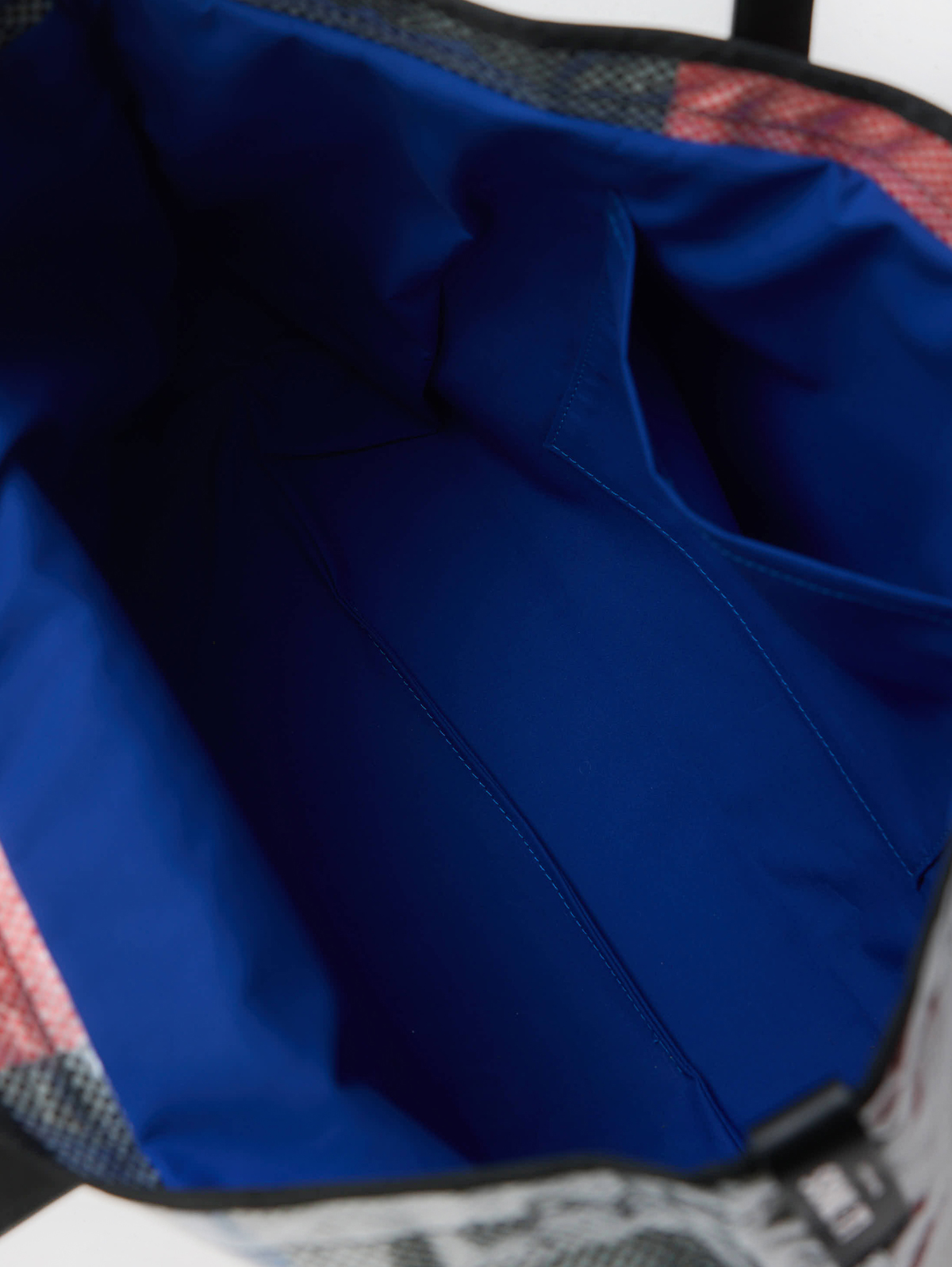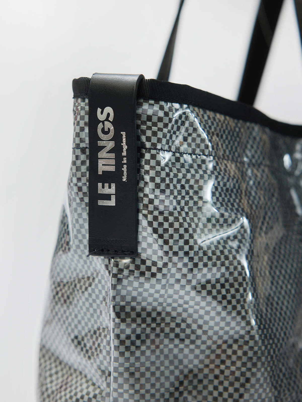 Lined with a premium durable cotton with an internal patch pocket. The tote outer is coated in recycled PVC which is showerproof and finished with a black grosgrain trim, with black leather debossed labels with silver foil at the front and side.