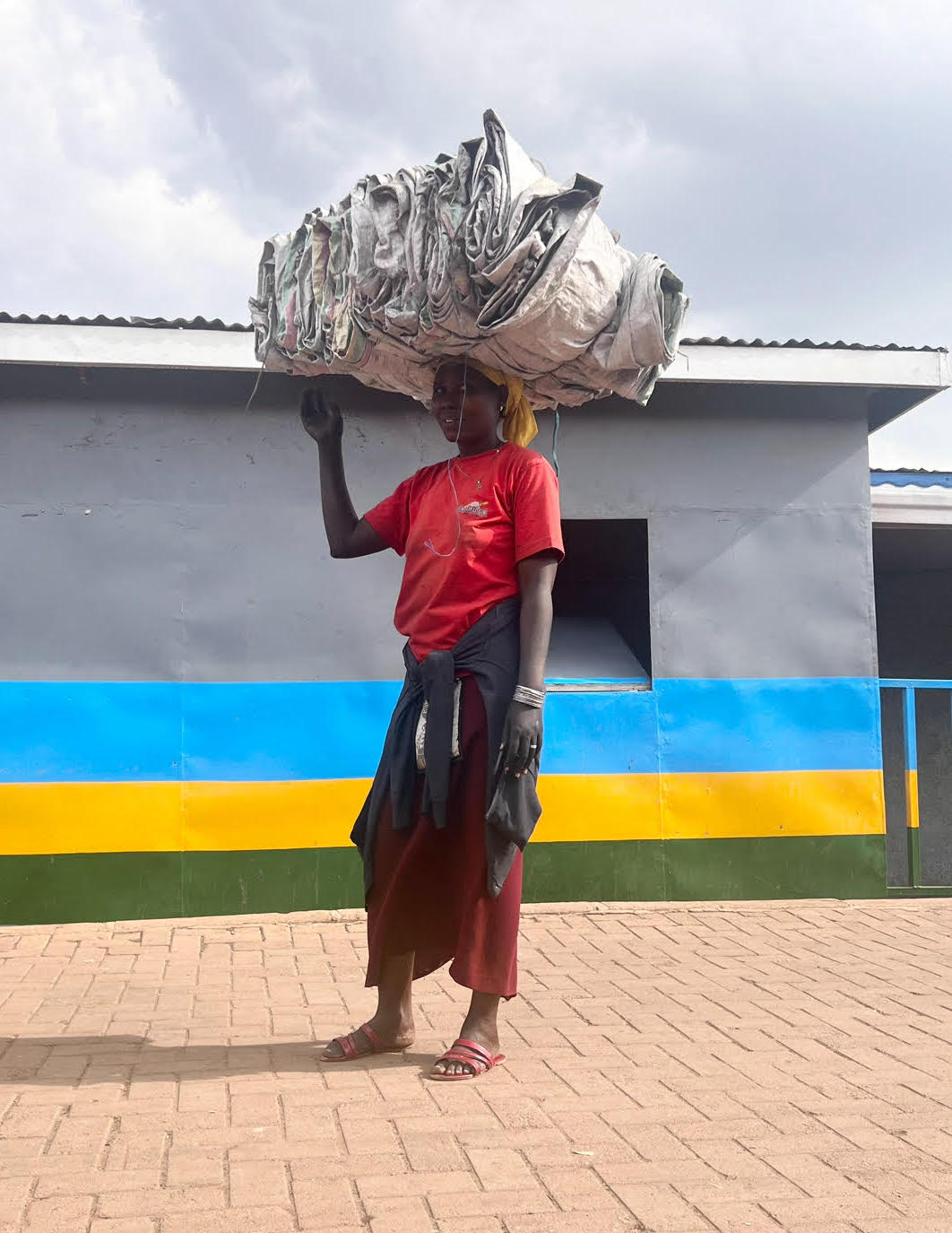 Whilst shooting in Kigali, we came across a lady carrying a bale comprised of 165 used rice/coal sacks on her head. We stopped her to purchase the whole bale of which she would normally sell the bags as single units. Her image challenged us to think about the materials we use mixed with the migration that each bags before we see it. We kept the bale intact as it made more sense to preserve her bundle. For sampling and production we sourced new bags with the identical colouring of the bags the lady carried, white with black graphics and the colours of the season red, gold and green. These bags herald new material processes with leather bases and edge coated handles that give our beautiful bags a super fine finish.